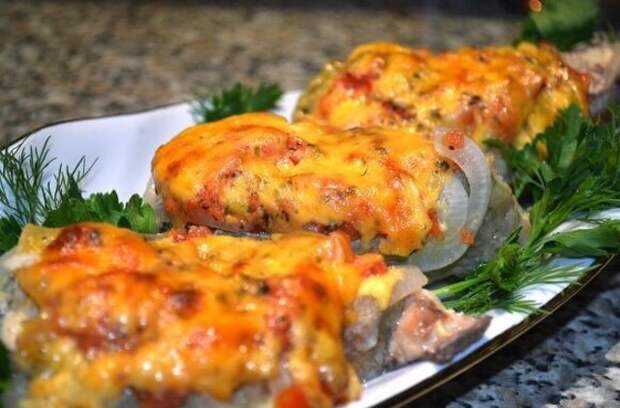 - Перекладываем филе на тарелку сверху укладываем масло сливочное, нарезанное кусочками, прикрываем еще одним филе. Откладываем в сторону тарелку с рыбой.